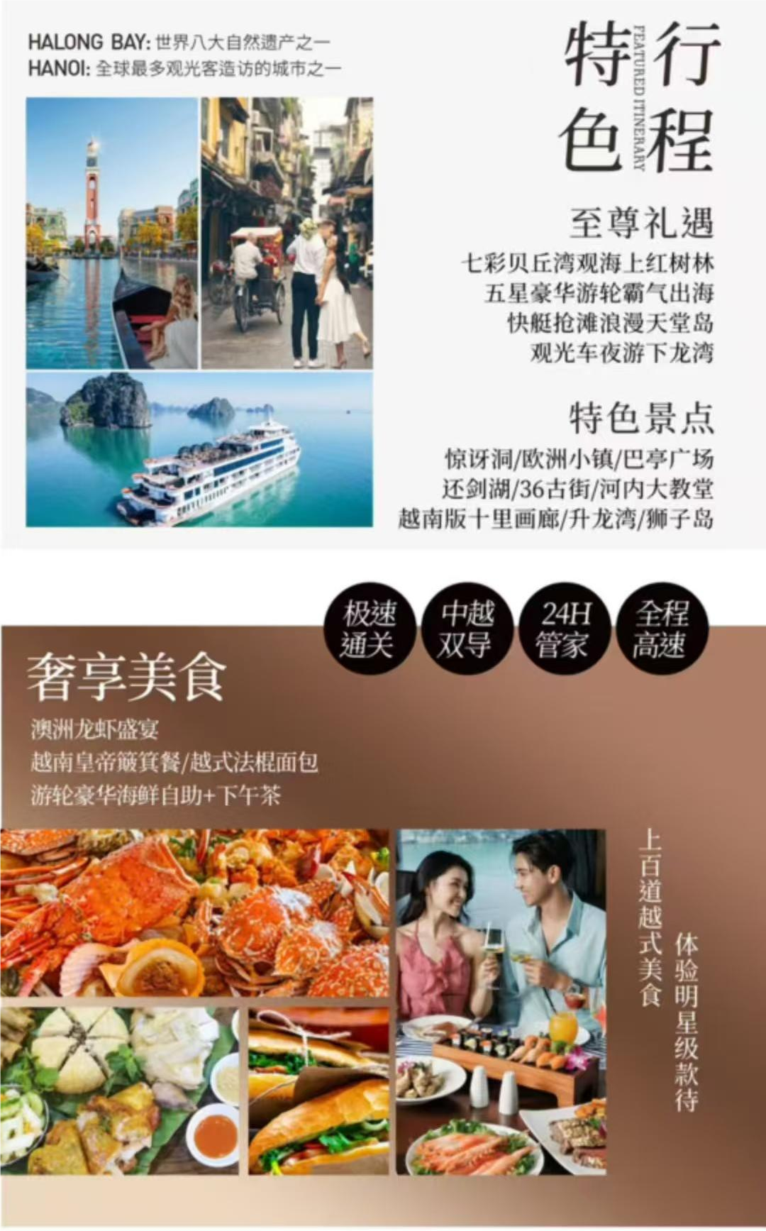 越南的早餐從一碗生滾牛肉粉開始,五星酒店自助早餐有幾十道菜,大部分人還是偏愛招牌生牛肉粉:生牛肉切片后用熱湯澆熟,肉質(zhì)鮮嫩,搭配越南Pho肉片,湯底口感鮮香酸咸,完全停不下來!另外飲品區(qū)還有各式鮮榨果汁,豆?jié){,牛奶,咖啡,還配有冰塊! 早餐后乘坐【sealife-octopus號或SYMPHONY或Ha Long Princess Day Cruise號或ambassador-cruise號或同級別】,暢游海上桂林—下龍灣。一邊聆聽抒情的音樂,邊觀賞下龍灣的美景,享用約 100 種高級菜肴,(含自助午餐+自助下午茶)。倘佯于萬頃碧波之中;漫游被國際教科文組織評為世界自然遺產(chǎn)之一的“海上桂林”—下龍灣,在 1500多平方公里的海面上、聳立著 3600 多座大小不一、千姿百態(tài)的喀斯特地貌的山石、更以其“海美、山幽、洞奇”三絕而享譽天下。 前往【驚訝洞】驚訝洞的特色是它很象天上宮殿的輝煌美麗。這里有經(jīng)數(shù)百萬年造化形成的,多彩多樣的巨型石乳,特別還有龍王形象及其極富人文性傳說的文化蘊味。洞內(nèi)的中心有四個大柱子支撐著,從柱腳到柱頂有許多奇形怪狀的鐘乳石,有的如魚有的似鳥,有的像人類生活畫面等等,中間和四周都有著多彩多樣的,巨大雄偉,精致柔美的石塊石乳,在燈光的照耀下,那些石乳忽然發(fā)亮反射著金剛石似的五彩光影。 換乘【接駁快艇】前往越南最浪漫、最漂亮的島嶼【天堂島】,天堂島是下龍灣唯一有沙灘的島嶼,金黃色的沙灘,蔚藍色的海水,仿佛置身世外桃源一般,登上天堂島,領略“會當凌絕頂,一覽眾山小”的感覺,環(huán)顧四周,如同進入蓬萊仙境。隨后返回碼頭。 前往【下龍灣海灘】綿延近千米的下龍沙灘,椰樹成林,碧浪白沙,海水明澈,碧藍天空一望無際,與海水相融相接,長長的海灘宛若一條白色綢帶蜿蜒在海岸邊。沙灘的愜意安然,赤足漫步在海邊上能感受到與浪花熱情的玩耍邀請。 隨后乘坐【觀光車環(huán)游下龍灣】,深入了解下龍當?shù)厣睢?/span> | |||