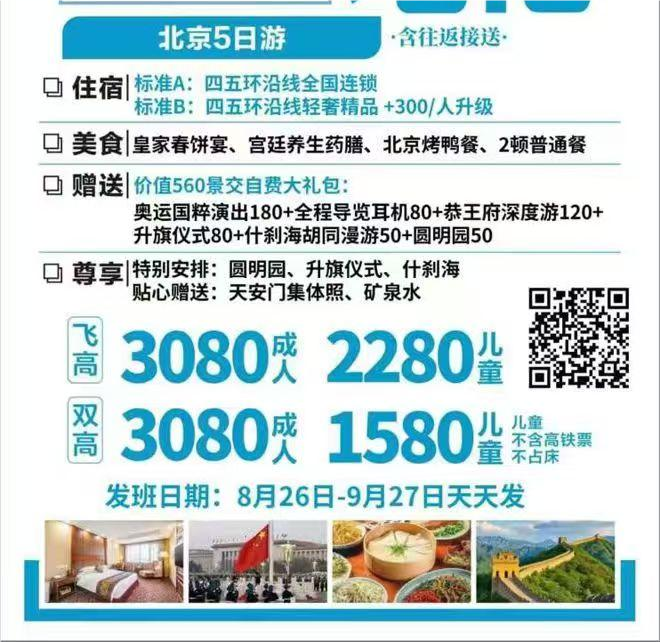 早餐打包,前往天安門(mén)廣場(chǎng)觀看大國(guó)禮儀神圣典禮【升國(guó)旗儀式】(如預(yù)約不上升旗則改為降旗,旅行社不承擔(dān)任何責(zé)任),游覽【毛主席紀(jì)念堂】瞻仰毛主席儀容(若遇政府關(guān)閉或限制團(tuán)隊(duì)流量預(yù)約不上則改為參觀外景,旅行社不負(fù)任何責(zé)任),游世界現(xiàn)存最大的古代宮殿建筑群【故宮博物院深度游】(首道門(mén)票,不少于2小時(shí)),身處紅墻黃瓦,金碧輝煌的殿宇樓臺(tái)中,穿越時(shí)光年輪追溯那鼎盛的康乾盛世,眼前浮現(xiàn)歷史的滾滾煙幕。 中餐安排特色【北京京味菜】特別安排品嘗北京烤鴨體驗(yàn)老北京的美食;后參觀【什剎海胡同漫游】(不少于45分鐘。)什剎海指前海、后海、西海三個(gè)湖泊及鄰近地區(qū),這里擁有大片優(yōu)美的湖面,也是北京著名的一片歷史街區(qū),眾多名人故居,王府等古跡散落其中,還有貼近老百姓生活的各種美食,后海酒吧街更是京城夜生活的老牌勝地。 游覽明清兩朝歷代皇帝祭天之地【天壇公園】是世界文化遺產(chǎn),明清兩代二十四位帝王舉行登基大典及祭祀天神的專用祭壇,也是世界上現(xiàn)存規(guī)模最大,最完美的古代祭天建筑群。(首道門(mén)票,不少于1小時(shí)),后觀北京【國(guó)粹表演】——京城第一秀(與海內(nèi)外上千名游客共同欣賞為北京奧運(yùn)特創(chuàng)編排,節(jié)目精彩絕倫,觀看1小時(shí));晚餐后入住酒店休息; ☆溫馨提示:1、當(dāng)天行程景點(diǎn)位于北京古老中軸線上,全天以步行為主。加之此中心區(qū)域?yàn)閲?guó)家重要職能部門(mén)所在地,交通管制嚴(yán)格明確,單行道內(nèi)不可隨意停車(chē)。故在此區(qū)域候車(chē)時(shí)間較長(zhǎng),步行路程較多,敬請(qǐng)?zhí)崆白龊眯睦頊?zhǔn)備,謝謝配合及理解。